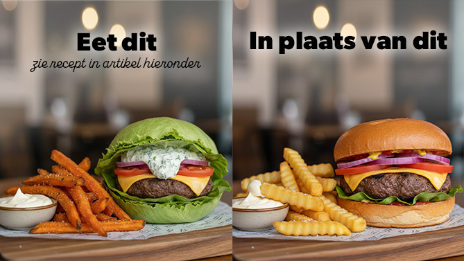 Je vervangt het broodje door knapperige sla en maakt je friet van zoete aardappel uit de oven.